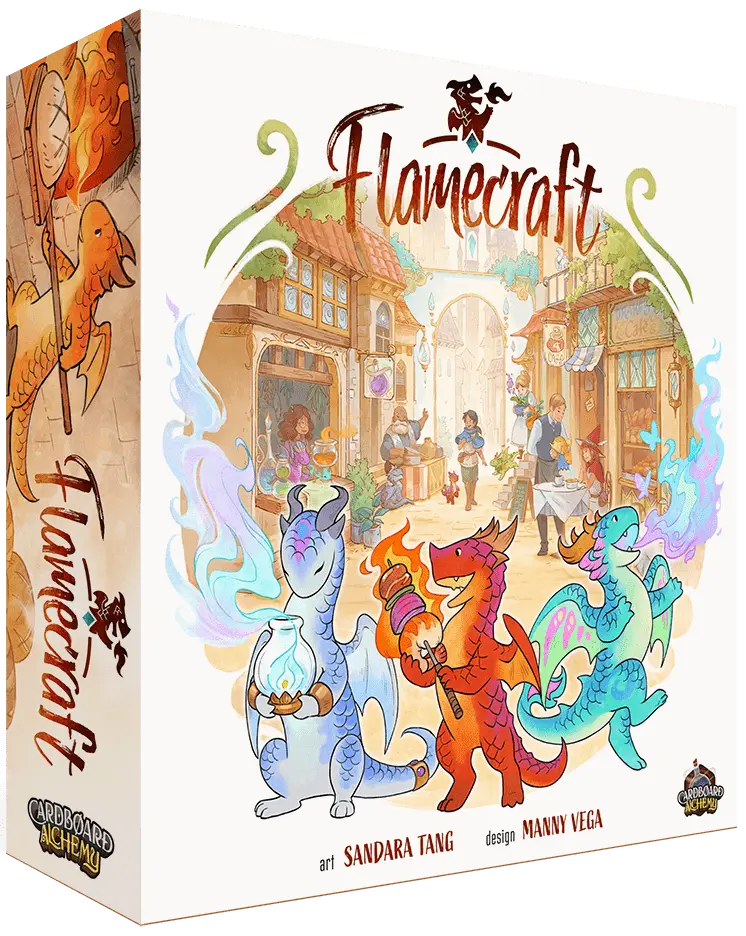 Artisan dragons, the smaller and magically talented versions of their larger (and destructive) cousins, are sought by shopkeepers so that they may delight customers with their flamecraft. You are a Flamekeeper, skilled in the art of conversing with dragons, placing them in their ideal home and using enchantments to entice them to produce wondrous things. Your reputation will grow as you aid the dragons and shopkeepers, and the Flamekeeper with the most reputation will be known as the Master of Flamecraft.